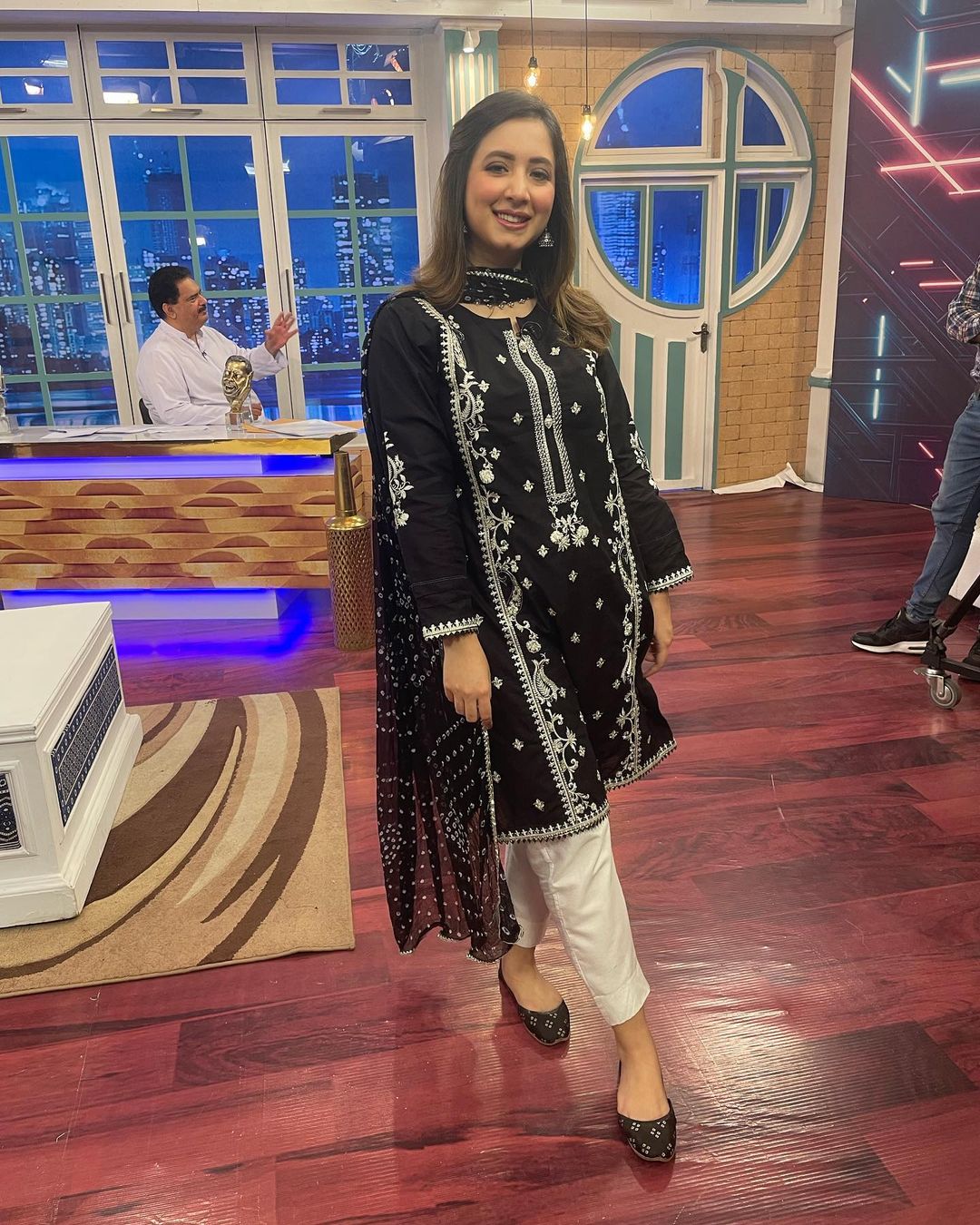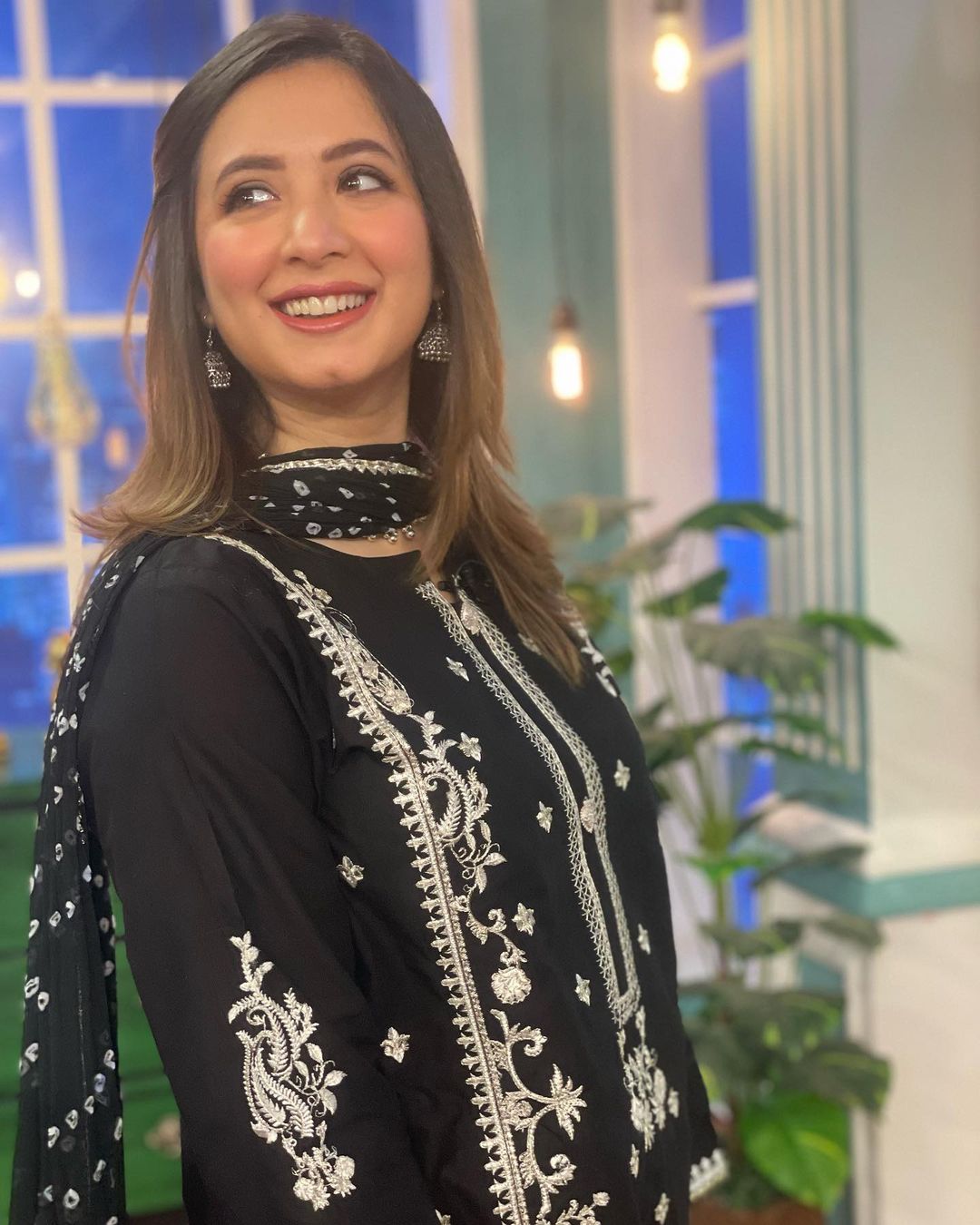She wrote, “Happiest wearing my favorite @omalbykomal. Desi, blingy but so breathable. Swipe right for the full picture of this lawn outfit .So lucky to get to do this for a living.”