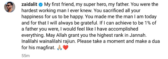 Zaid Ali posted a message expressing his wish to be even a fraction like his father and thanked him for his support in his life. He also requested his fans to pray for his father’s soul.