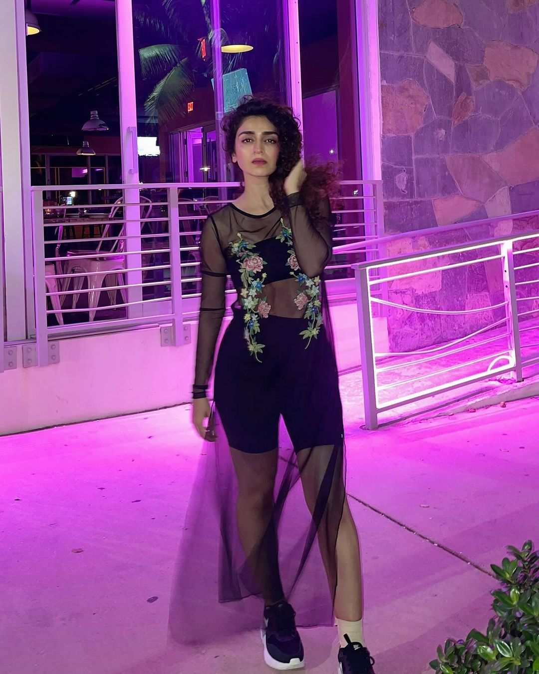 She sported biker shorts and a black tube top under a mesh dress adorned with floral prints on each side.