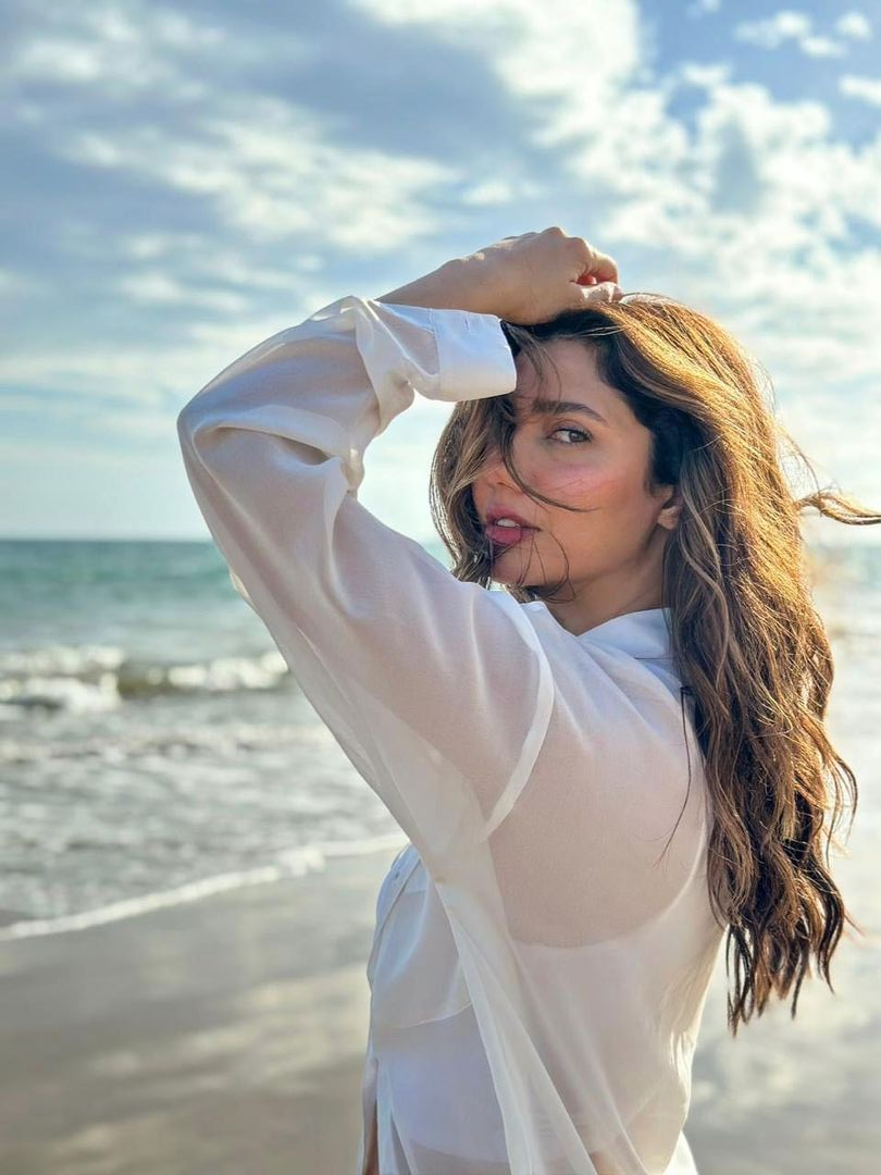 Once again, Khan caused a sensation on the internet by sharing scintillating beach snapshots in which she displayed her mastery of facial expressions.