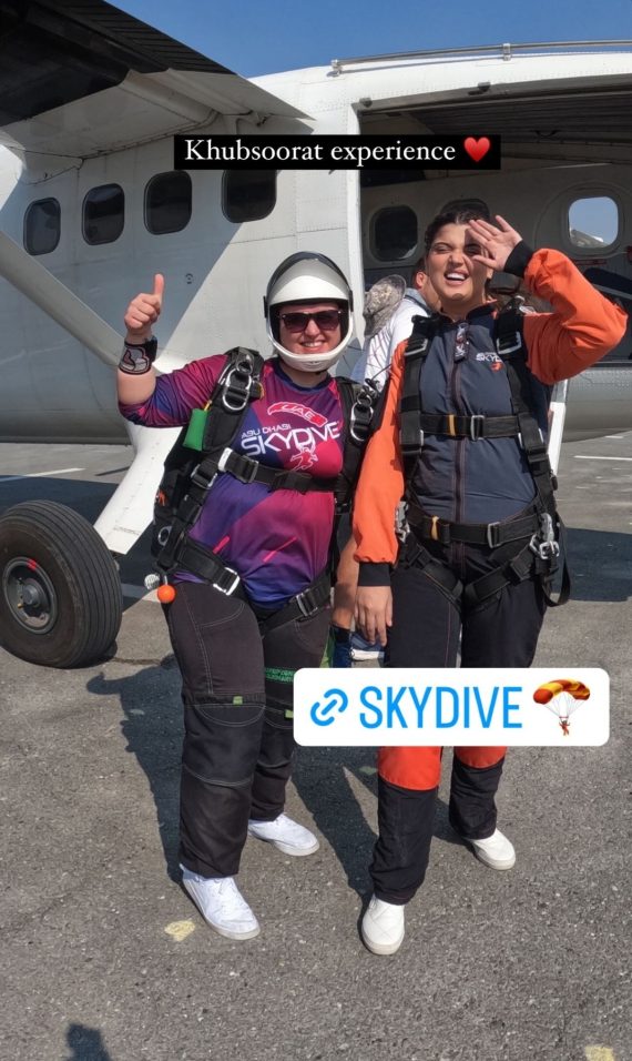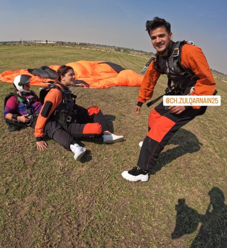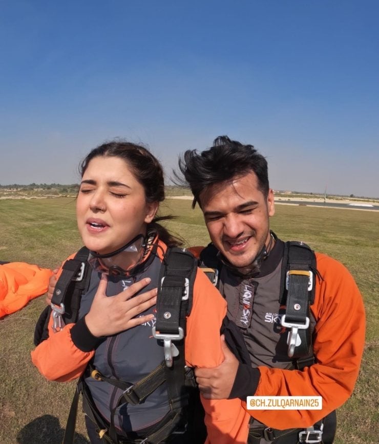 Adding another exciting chapter to their vacation, the influencers recently went on an exciting skydiving journey. Sharing their nervousness both Kanwal Aftab and Zulqarnain Sikandar completed their skydiving ride. Kanwal Aftab chose a female instructor.  After their adventurous journey in the sky, the couple shared pictures from this daring adventure, providing a glimpse into their adrenaline-filled escapades.