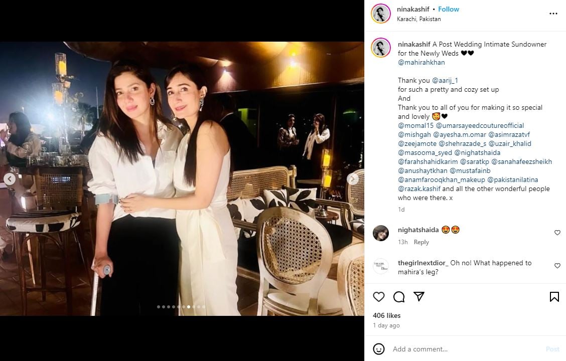 Khan recently attended a star-stunned party with her husband in which she can be seen holding a stick into her while posing for the camera. the picture was shared by Naina Kashif who is the dearest friend of Mahira Khan. However, she did not reveal any details about the injury or her condition, as she maintained her privacy.