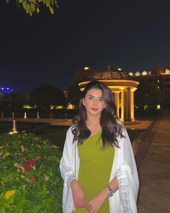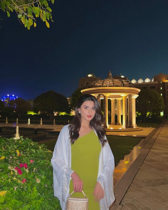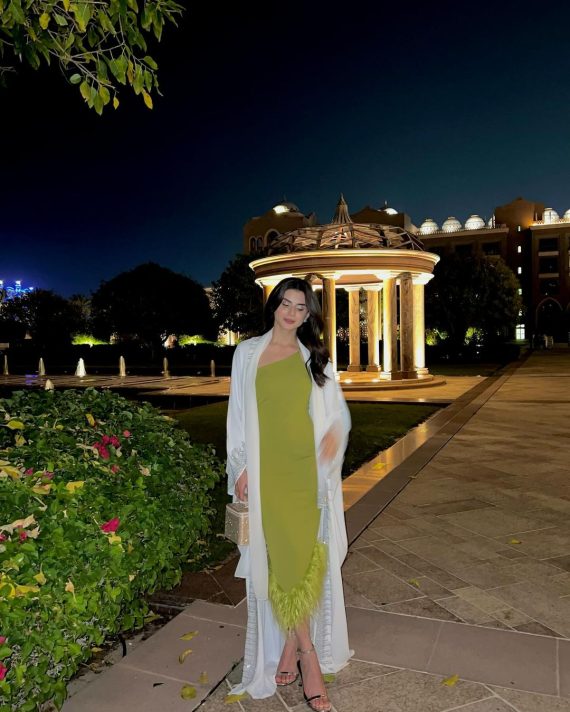 Zubab recently went on vacation and opted to wear a bright lime green midi dress, pairing it with a white abaya worn like a shrug over her dress. She shared some stunning pictures of her look, and here are a few.