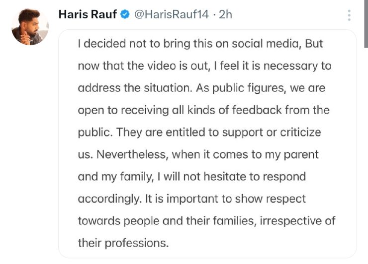Haris Rauf wrote, “I decided not to bring this on social media, but now that the video is out, I feel it is necessary to address the situation. As public figures, we are open to receiving all kinds of feedback from the public. They are entitled to support or criticize us. Nevertheless, when it comes to my parent and my family, I will not hesitate to respond accordingly. It is important to show respect towards people and their families, irrespective of their professions”