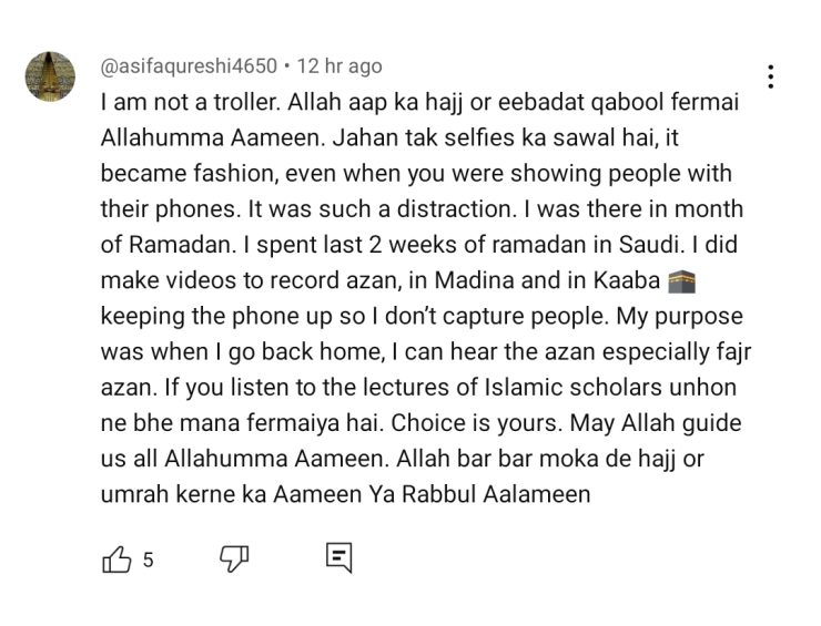 In his vlog, Yasir Nawaz asked Nida Yasir to give a message to those who trolled them for taking selfies at Khana Kaaba and Masjid E Nabwi. Nida Yasir said, “I would pray for their guidance, what else can I say”.