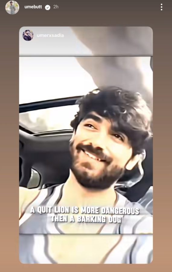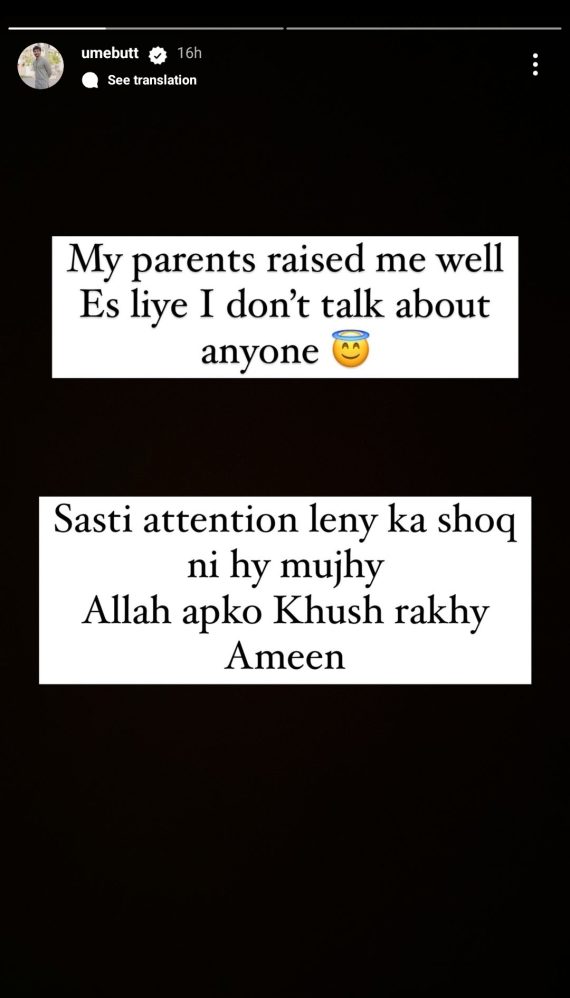In response, Umer Butt took to Instagram to address Mirza’s comments indirectly. He posted a message stating, “My parents raised me well that’s why I don’t talk about anyone. I don’t want to do cheap publicity stunts, May Allah keep you happy in life ( Sasti attention leny ka shoq ni hy mujhy Allah apko Khush rakhey Ameen) “. and reshared a fan’s reel with the caption, “A quiet lion is more dangerous than a barking dog.”