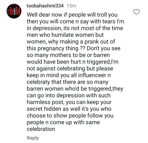 She later revealed that the pregnancy photo was simply a costume for her ongoing shoot. However, the internet reacted negatively to the prank, with many criticizing Saheefa for what they viewed as a distasteful move.