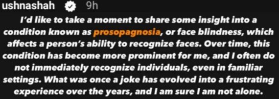 Ushna Shah discussed her face blindness on her own show, revealing that the condition has become so severe it started affecting her work. Ushna revealed that “she was not able to recognize an actor that she used to go to the gym with. She revealed that she worked with actor Akhter Husnain in Aakhir Kab Tak where he played her uncle. She revealed that due to fake news, she doubted him to be an animal abuser and when she saw him at her gym, she never talked to him. She then saw him on sets of her drama and did not recognize him. She could not tell that the two people were the same for 4 months when the actor asked her and she put two and two together.”