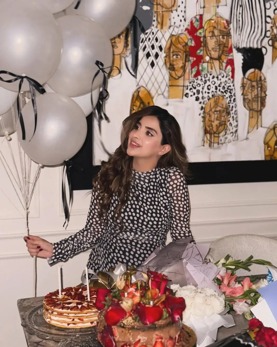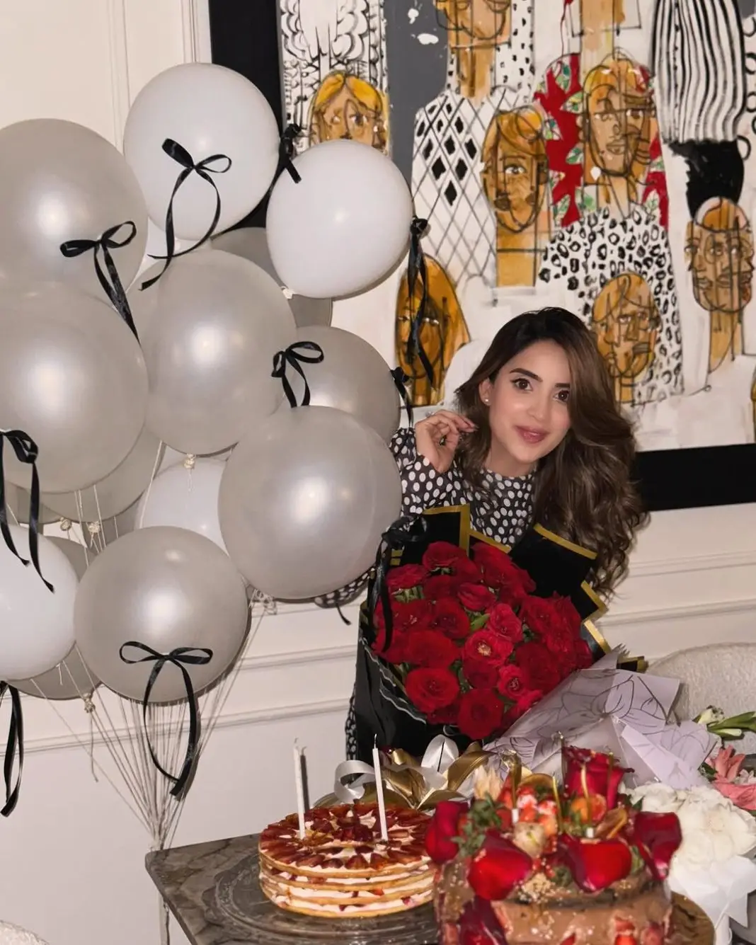 On Saboor Aly’s birthday, her husband, Ali Ansari, surprised her with a cake, red roses, and balloons. She looked stunning in a stylish dress with flawless hair and makeup. Saboor shared their special moments with the world. Check it out: