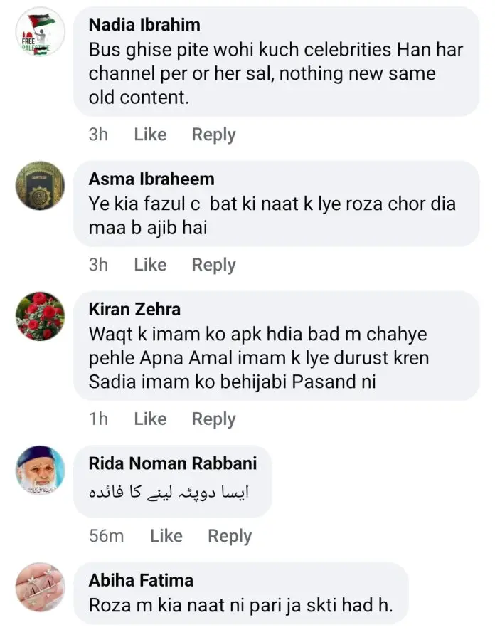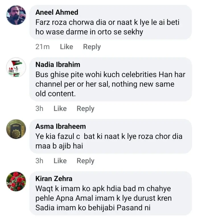 Sadia Imam’s statement about her daughter skipping her fast to recite Naat in the live Ramadan transmission has upset social media users. Many are criticizing her for making an irresponsible remark.