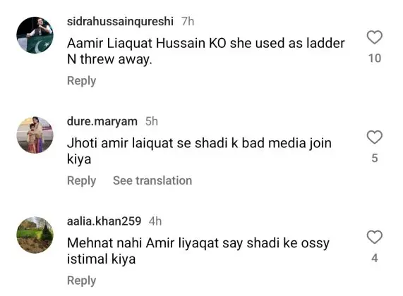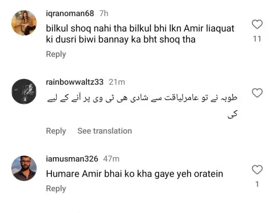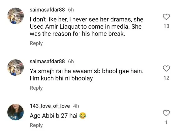 Almost all social media users rejected Syeda Tuba’s fabricated showbiz story. One fan wrote, “You are lying; everyone knows you entered the showbiz industry through Dr. Aamir Liaquat Hussain.” Another commented, “She used Dr. Aamir Liaquat Hussain as a ladder to gain fame and then abandoned him.”