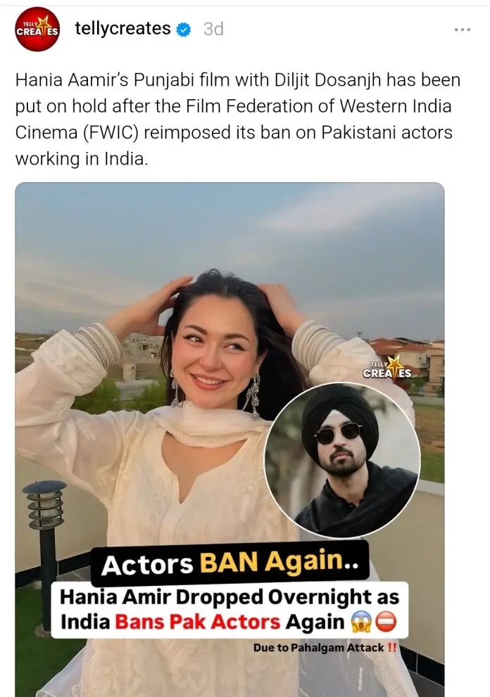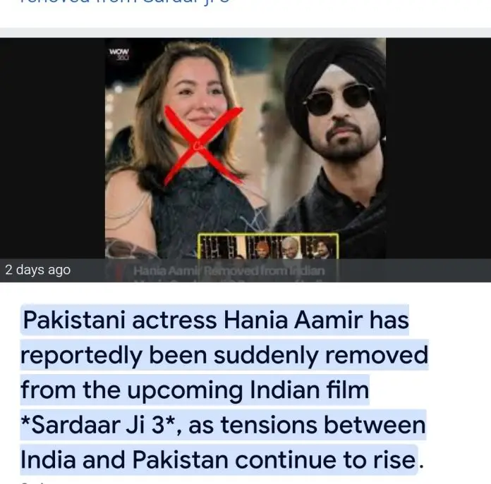 Hania Aamir is Pakistan’s most followed and celebrated television and film actress, boasting a massive Instagram following of 18.3 million. She has a strong fan base in India as well. A few months ago, she made headlines for signing the Indian Punjabi movie “Sardar Ji 3”. The film wrapped its shooting in the UK last month, with Neeru Bajwa and Diljit Dosanjh playing the lead roles. Hania Aamir and her fans were excited about the release of “Sardar Ji 3”, but after the Pahalgam incident, the film’s release has faced obstacles.
