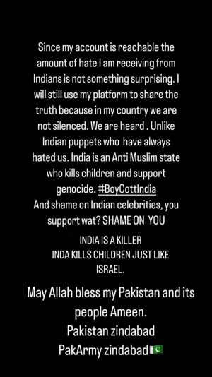 Minal Khan took to Instagram to share a powerful message against rising Indian hatred. With a following of over 10 million, she used her social media influence to speak out boldly. She revealed that since her account is still accessible to Indian users, she has been receiving a flood of hate messages—something she fully expected. Despite the backlash, Minal expressed her relief at being able to speak freely as a Pakistani, adding that, unlike “Indian puppets,” she doesn’t have to censor her voice.