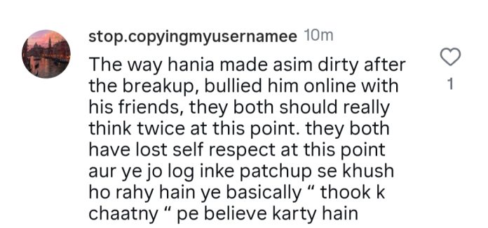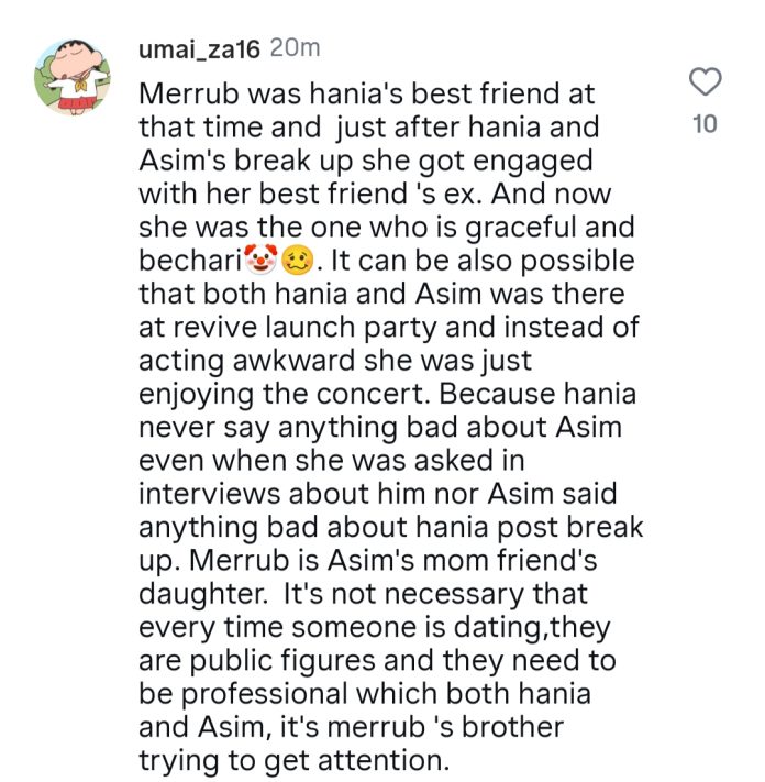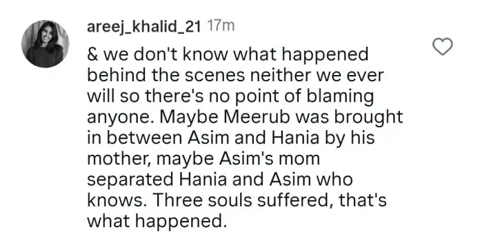 The internet is now buzzing with opinions. Some are criticizing Merub, while others are supporting her. One person commented, “Stop playing the victim card. Karma is hitting your sister,” while another said, “Asim only used Merub to make Hania jealous.” Some even blamed Merub for coming between Asim and Hania.