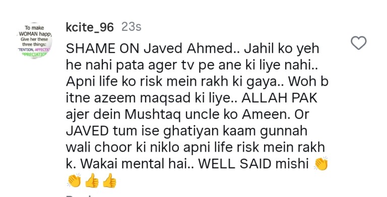 Social media users are absolutely loving Mishi Khan’s fiery takedown of Jawad Ahmed and can’t get enough of her bold video. Many called it a “perfect response,” while others praised her for saying what everyone was thinking. Even designer Maria B joined in and dropped a comment under the post. Here are some of the reactions: