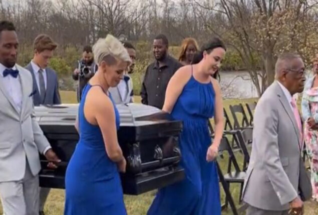A groom's unusual wedding entrance, "walking" down the aisle in a coffin, has perplexed the internet. The groom's friend posted...