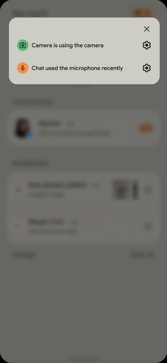 From the leaked images, it seems that there will be a small icon in the top-right corner that will alert if the camera or microphone is being used. Tapping on that icon will reveal which application is what and there will be a quick way to disable the access.
