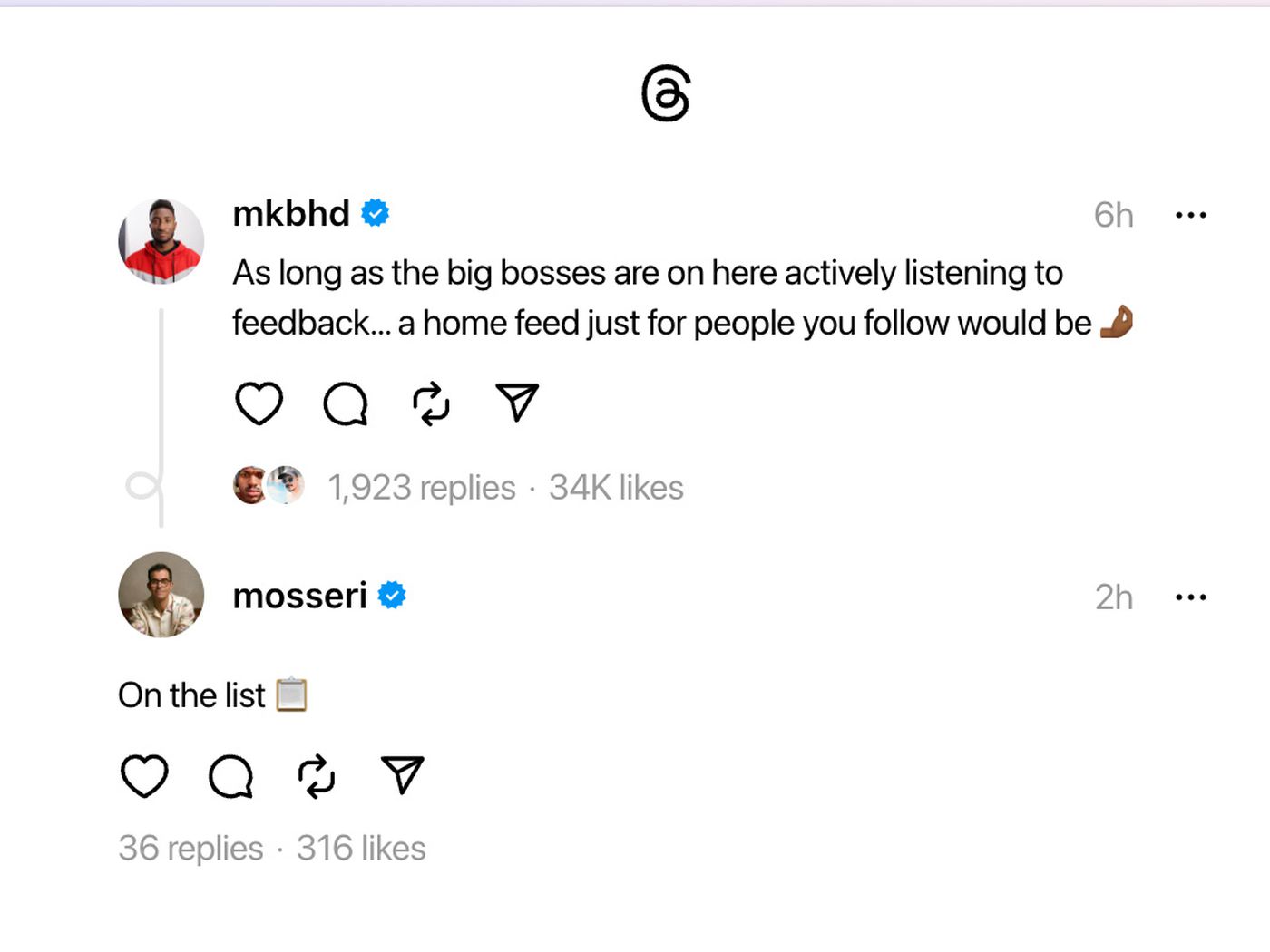 Instagram’s CEO, Adam Mosseri, has acknowledged the demand for a Threads home feed exclusively showcasing posts from followed accounts, stating that it is a feature that is being considered for addition.