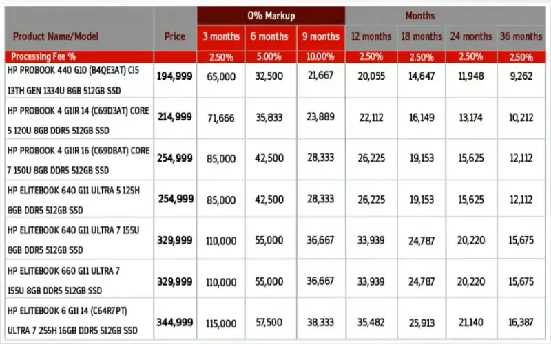 Through this program, a variety of HP laptops are available on easy installments with zero interest or minimal monthly charges. Payments can be spread over flexible periods of 3, 6, 9, 12, 18, 24, or up to 36 months, depending on the laptop model and applicable processing fees.
