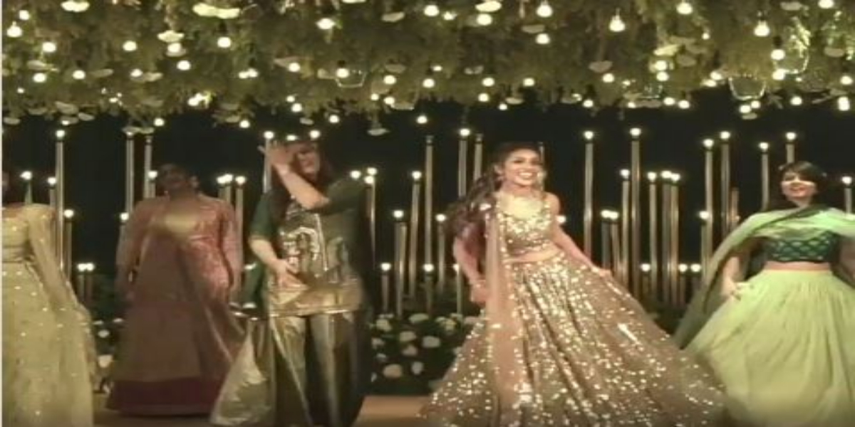 The bride, dressed in a stunning golden lehenga, flaunts her graceful moves as she dances to a modified version of Leja Leja.