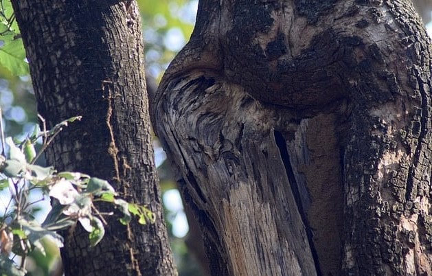 The owl can be seen perched on a tree, its neck turned towards the camera. The colour of the tree bark and the owl are nearly identical, making it difficult to detect the presence of an owl at first.