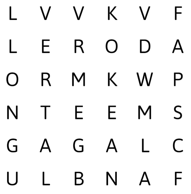 This picture shows a 6×6 grid of letters. In this grid of a word search puzzle, there are 7 words buried. Are all of them visible?