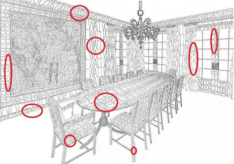 In this problem, you must find all 9 hidden words within the Black & White Dining Room image. You probably won’t notice all of the words right away. But, after a few seconds, you may be able to recognize the words buried within the image. Even the most astute observers are finding this brain twister difficult.