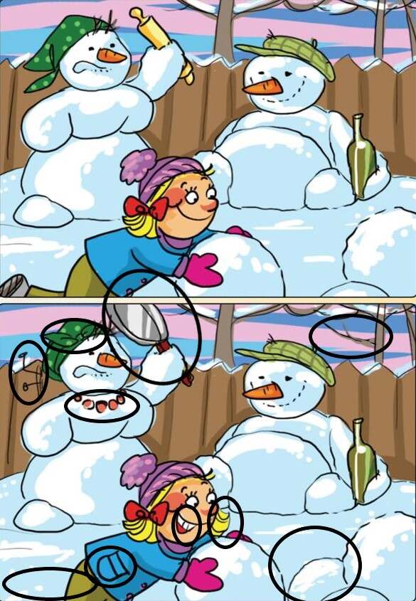 A small girl is making a family of snowmen in the image. The Mother appears to be berating the spouse. The two photos differ by a total of ten points, and the task is to identify these differences in 11 seconds.