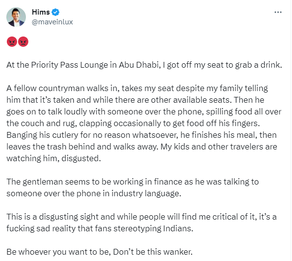 “While I was at the Priority Pass Lounge in Abu Dhabi, I temporarily left my seat to get a drink. During that time, a fellow countryman arrived, ignoring my family’s explanation that the seat was taken and other empty seats were available. He then loudly conversed on the phone, causing food to spill onto the couch and rug. Occasionally, he clapped to remove food from his fingers,” the caption explained.