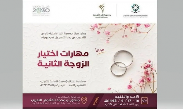 تنظیم کے ٹیکنیکل اینڈ ووکیشنل ٹریننگ کارپوریشن کے سرکاری ترجمان فہد العتیبی کے اس انکشاف کے بعد سامنے آیا ہے کہ کارپوریشن میں پرائیویٹ ٹریننگ کی جنرل ایڈمنسٹریشن کے مانیٹرنگ یونٹ نے “دوسری بیوی کے انتخاب کے لیے ہنر” کورس کا اشتہار ملاحظہ کیا۔ انہوں نے انتظامیہ سے رابطہ کیا اور اس اشتہار کو فوری طور پر ہٹانے کا حکم دیا۔