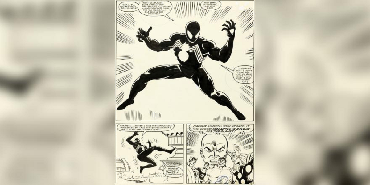 مارول کامکس ’سیکریٹ وارز نمبر 8‘ کے صفحہ نمبر 25 کے لیےبنائے گئے مائیک زیک کے آرٹ ورک میں اسپائیڈیز کا کالا سوٹ پہلی بار منظر پر آیا۔