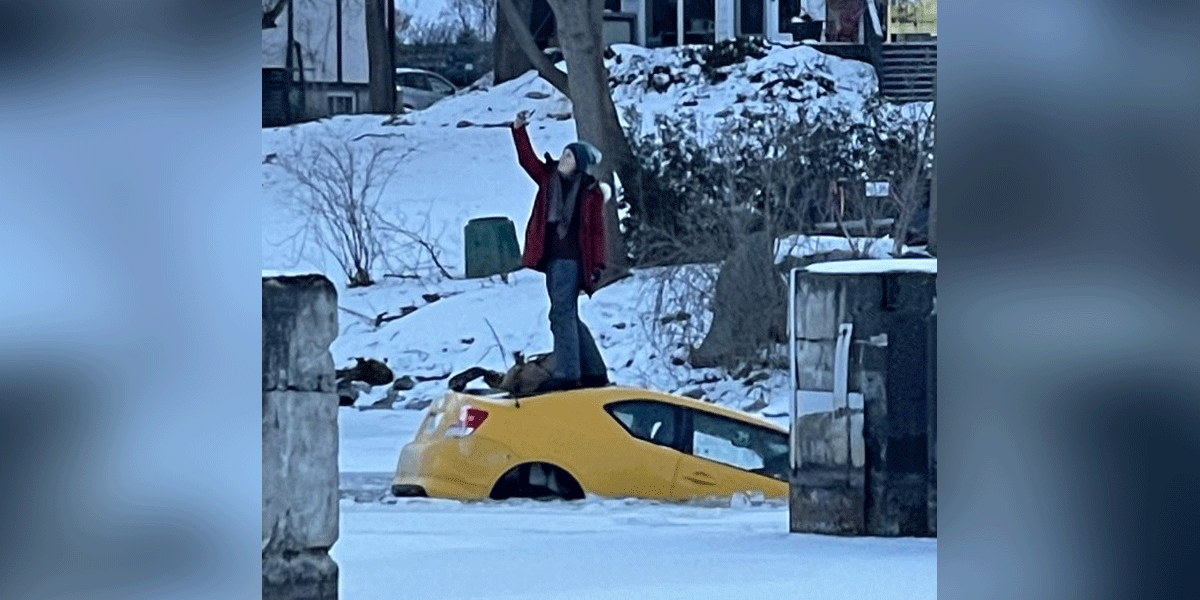 کینیڈا میں ایک خاتون نے جمے ہوئے دریا پر گاڑی چلائی اور اپنی ڈوبتی کار کے اوپر سیلفی لینے کھڑی ہوگئی۔