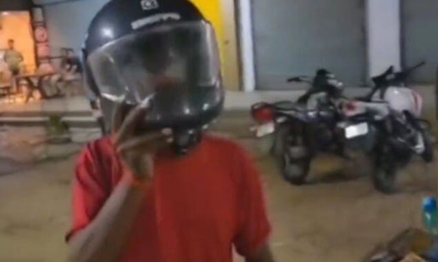 ویڈیو میں لوگوں کے سمجھانے پر ٹھیلے والا بمشکل ہیلمٹ اتارنے پر راضی ہوا۔