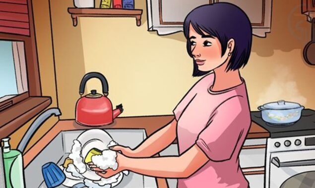 دراصل خاتون کے دائیں ہاتھ کی جانب ایک چائے کی کیتلی رکھی ہے جس کی ٹونٹی بہت چھوٹی ہے۔