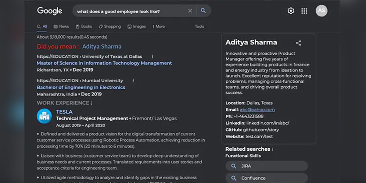 ایک LinkedIn صارف آدتیہ شرما، جو HiCounselor کے شریک بانی اور چیف ایگزیکٹیو آفیسر ہیں، نے ایک ریزیومے کا اس انداز میں خاکہ پیش کیا جس نے پلیٹ فارم پر بہت سے لوگوں کو تعریف کرنے پر مجبور کردیا۔ ریزیومے ذیلی عنوانات کے طور پر تعلیم اور کام کے تجربے کے ساتھ Google تلاش کے نتائج کا ایک ڈیزائن معلوم ہوتا ہے۔
