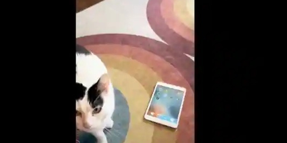 ویڈیو میں دیکھا جا سکتا ہے کہ بلی آئی پیڈ میں مصروف ہے لیکن اچانک آئی پیڈ بن ہو جاتا ہے۔