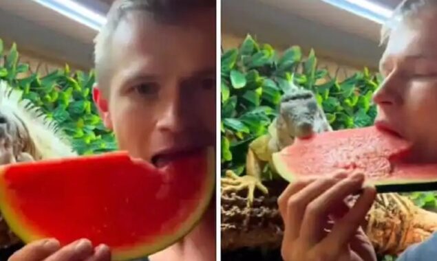 وائرل ہونے والی ویڈیو میں دیکھا جا سکتا ہے کہ آئگوانا اپنے مالک کے تربوز پر جھپٹا مارنے میں کامیاب ہو جاتا ہے۔