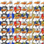دوسری آخری قطار میں پینگوئن کو سرمئی کوٹ پہنے ہوئے شتر مرغ کے بائیں طرف سے جھانکتے ہوئے دیکھا جا سکتا ہے۔