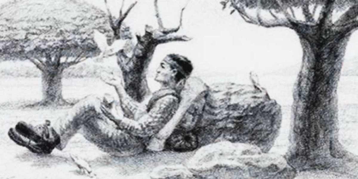 آدمی اور درخت کے درمیان کی جگہ کو دیکھیں، گھوڑا اس جگہ کے درمیان ہے جو اپنے مالک کے اوپر کھڑا ہوا ہے۔