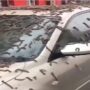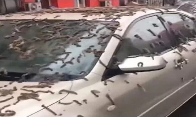 سوشل میڈیا پر وائرل ہونے والی اس ویڈیو میں دیکھا جاسکتا ہے کہ ایک سڑک پر قطار میں کھڑی گاڑیوں پر سیکڑوں کی تعداد میں کیڑے واضح طور پر نظر آرہے ہیں تاہم زیادہ تر کیڑے مردہ حالت میں ہیں۔