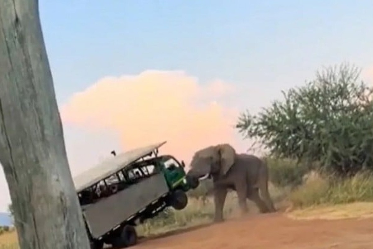 جنوبی افریقہ کی ایک ویڈیو سوشل میڈیا پر خوب وائرل ہورہی ہے جس میں ایک ہاتھی کو سیاحوں پر مشتمل سفاری ٹرک کو متعدد بار ہوا میں اچھالتے ہوئے دکھایا گیا ہے۔