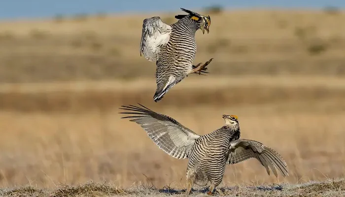 تصویر میں دو نر گریٹر پرائیری چکنز کی لڑائی دکھائی گئی ہے جو افزائشِ نسل کے موسم میں ’’لیک‘‘ نامی مقام پر اکٹھے ہو کر ماداؤں کی توجہ حاصل کرنے کی کوشش کرتے ہیں۔