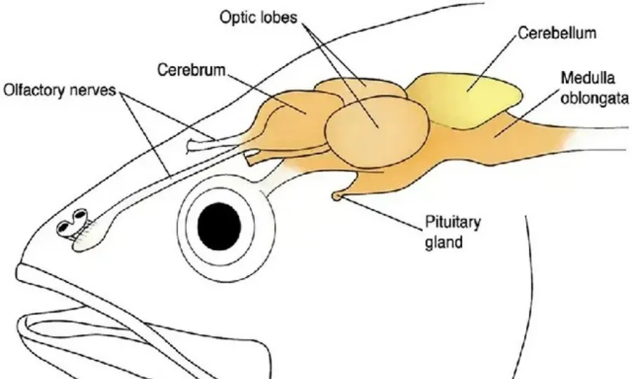 مچھلی کے دماغ کا اگلا حصہ سونگھنے، یادداشت اور بصارت جیسے اعلیٰ افعال انجام دیتا، جبکہ (برین اسٹیم)، جو زندگی کو برقرار رکھنے کے لیے سب سے اہم حصہ ہے، جسم میں ریڑھ کی ہڈی کے قریب واقع ہوتا ہے۔ جب تک برین اسٹیم محفوظ رہے گا، مچھلی گلپھڑوں کے ذریعے سانس لے سکتی ہے اور خون کی گردش برقرار رکھ سکتی ہے، جبکہ مچھلی کے تیرنے کے لیے دماغ سے مسلسل احکامات ضروری نہیں ہوتے بلکہ یہ عمل ریڑھ کی ہڈی میں موجود خودکار عصبی نیٹ ورکس کے ذریعے انجام پاتا ہے، اس لیے سر کے نقصان سے یہ صلاحیت متاثر نہیں ہوتی۔