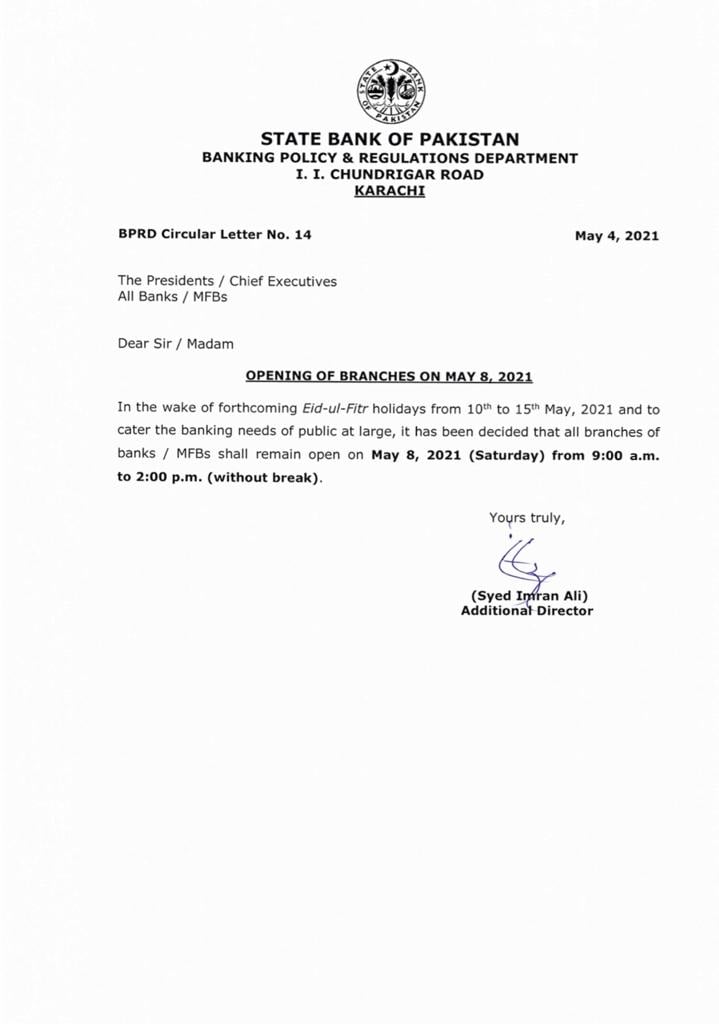 نوٹیفکیشن میں مزید بتایا گیا ہے کہ عوام کی سہولیات کے لئے 8 مئی، 2021 کو تمام بینک اور ان کی شاخیں کھلی رہینگی۔