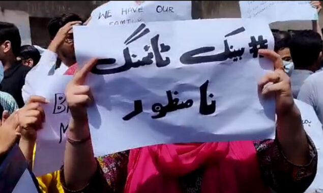نجی بینکوں کے ملازمین  ہفتے کی چھٹی ختم کرنے کے خلاف احتجاج کررہے ہیں۔