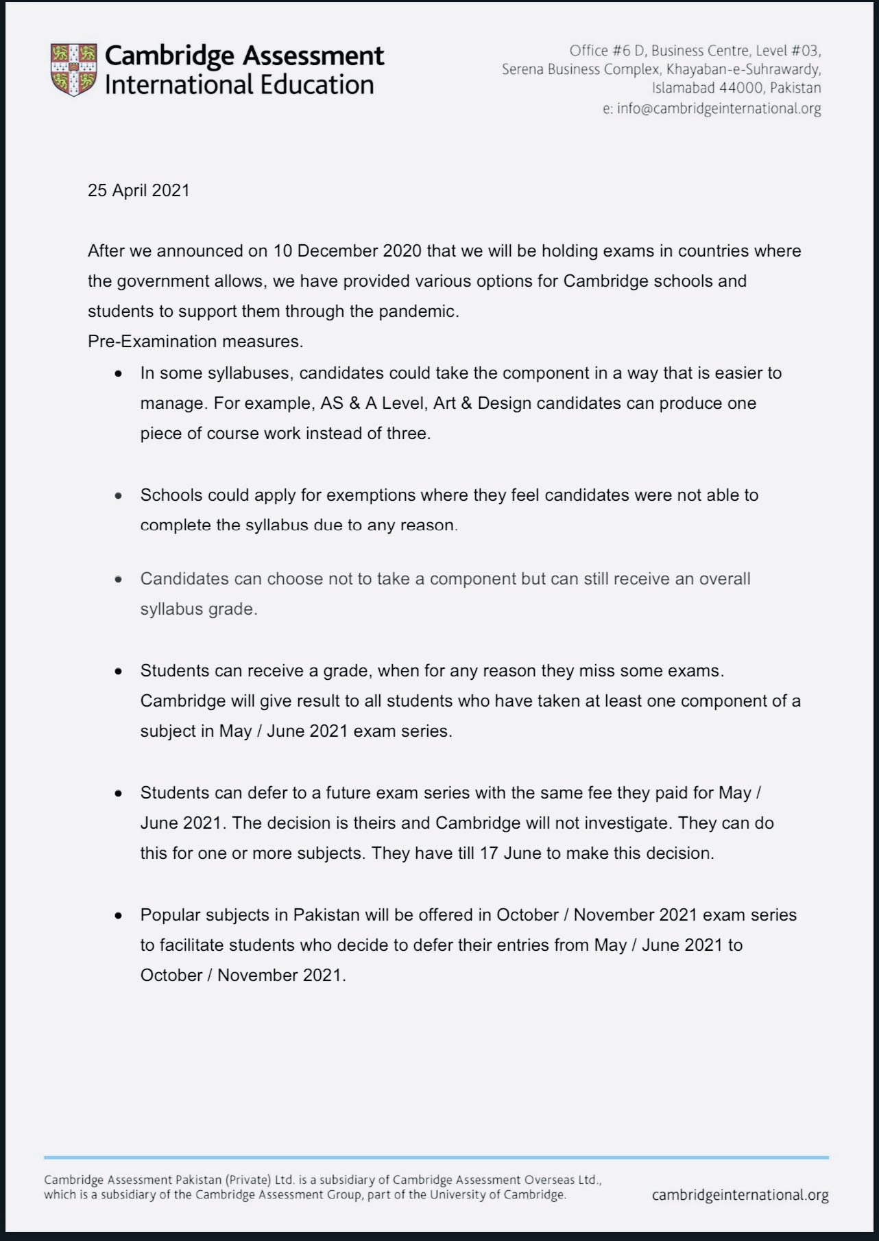 تفصیلات کے مطابق کیمبرج امتحانات کے لئے کیمبرج انتظامیہ کی جانب سے گائیڈلائن واضح کرنے کے لئے ایک خط جاری کیا گیا ہے۔