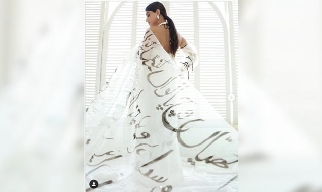 اداکارہ نے تصویر میں رحمت اجمل کی ڈزائن کردہ ساڑھی زیب تن کی ہوئی ہے ۔
