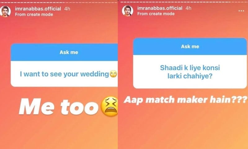 ایک صارف نے اپنی خواہش کا اظہار کرتے ہوئے کہا کہ وہ عمران عباس کی شادی دیکھنے کے خواہاں ہیں، جس پر اداکار نے ’می ٹو‘ لکھا، یعنی وہ خود بھی اپنی شادی دیکھنے کے خواہاں ہیں۔