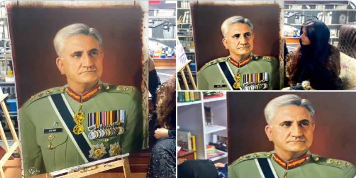 تفصیلات کے مطابق سماجی رابطے کی ویب سائٹ ٹوئٹر پر رابی پیرزادہ نے آرمی چیف جنرل قمر جاوید باجوہ کی تیارہ کردہ پینٹنگ کی تصویریں شیئر کی ہیں جو اُنہوں نے خود اپنے ہاتھوں سے تیار کی ہیں۔