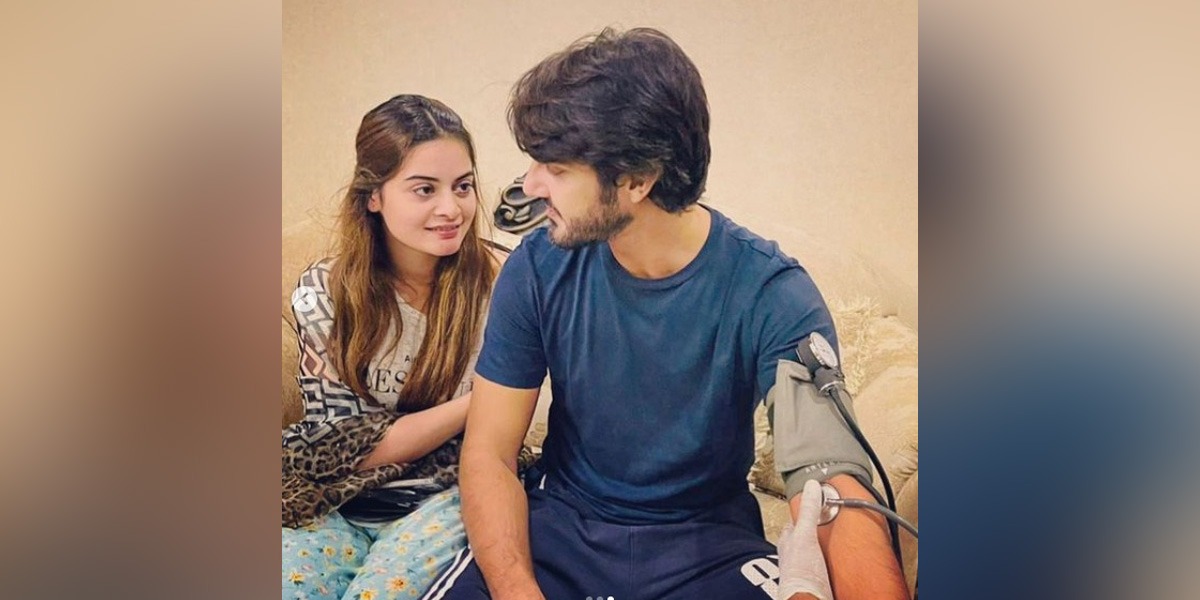 اِن تصویروں میں دیکھا جا سکتا ہے کہ احسن محسن اکرام عالمی وباء کورونا وائرس سے بچاؤ کی ویکسین لگوا رہے ہیں اور اس دوران انہوں نے منال خان کا ہاتھ پکڑا ہوا ہےاور وہ ان کا دھیان بٹا رہی ہیں۔